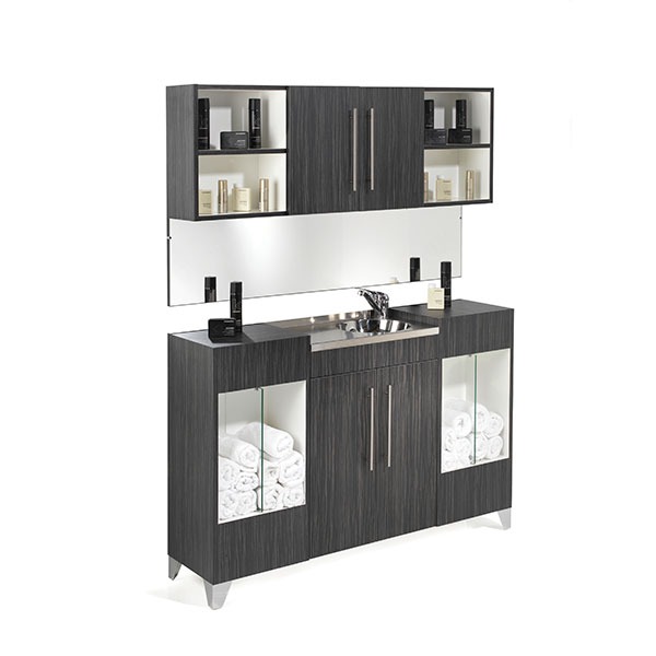 The central part of the opal vanity unit features a stainless steel basin and worktop with a single cold and hot water, chrome tap.